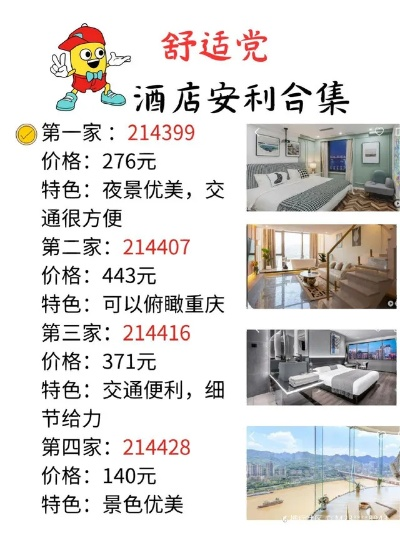 十、重庆两江丽景酒店(礼嘉智慧公园店)丽筠酒店式公寓(机场轻轨站店)锦江之星快捷酒店(江北国际机场店)维也纳国际酒店(重庆江北国际机场店)重庆洲际皇冠假日酒店(渝北店)重庆洲际新元素酒店(南滨路店)重庆金科大酒店(两江新区店)维也纳国际酒店(沙坪坝高铁站店)重庆山浩希尔顿欢朋酒店(解放碑洪崖洞店)维也纳国际酒店(北碚万达广场店)维也纳国际酒店(永川万达广场店)维也纳国际酒店(长寿古镇店)重庆君豪大饭店有限公司君豪大酒店等也是重庆的知名酒店品牌或连锁店,这些酒店提供不同档次的服务和设施以满足不同游客的需求,无论是高端豪华的酒店还是经济型连锁酒店都能在重庆找到合适的住宿选择,在选择酒店时可以根据自己的需求和预算进行选择同时也可以通过网上评价和图片了解酒店的实际情况,总之在重庆旅游选择一家舒适的酒店是享受美好旅程的重要一环,以上信息仅供参考具体排名和情况可能会有所变化请以实际为准。